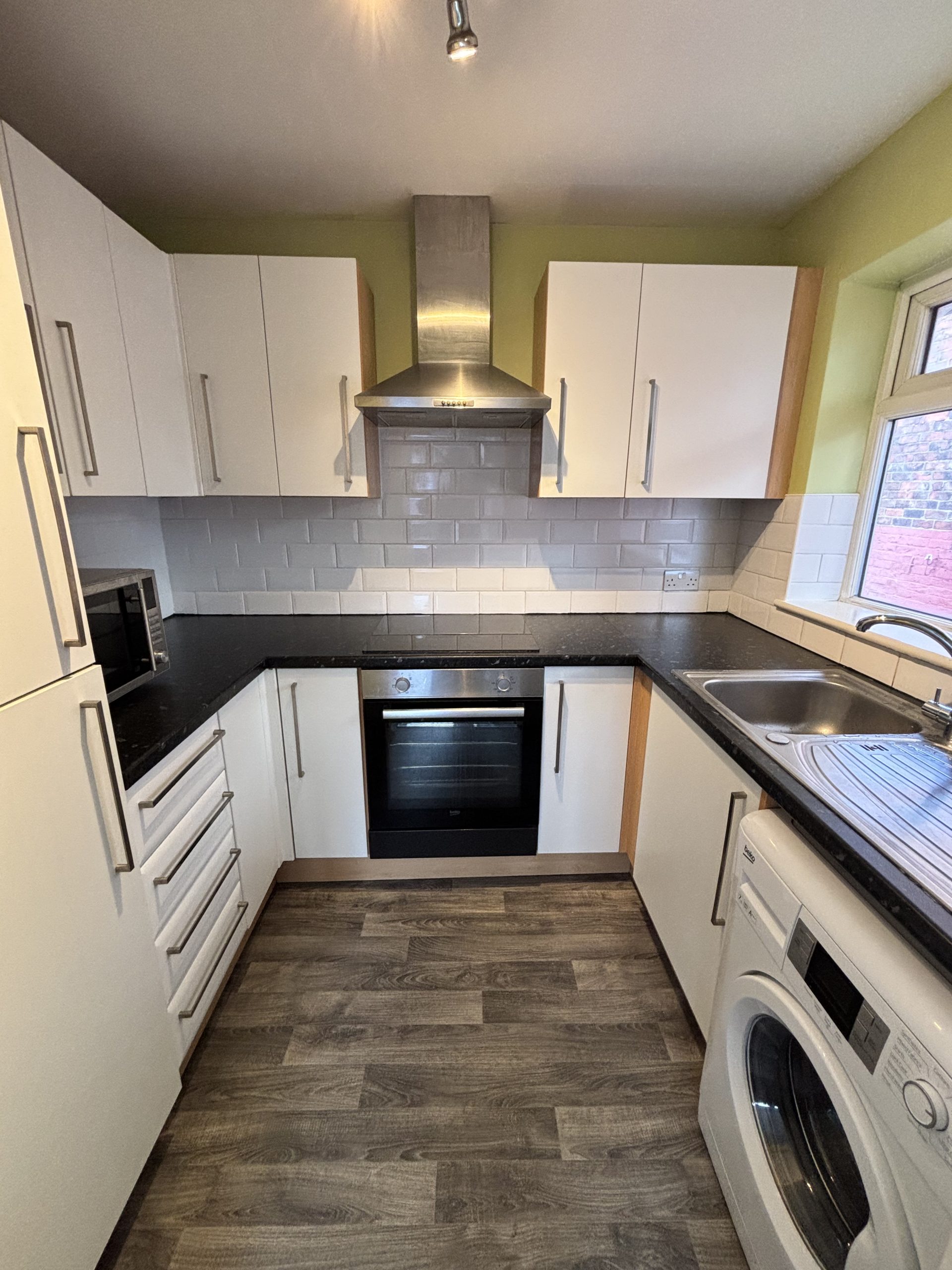 Well contained kitchen with integrated fridge and freezer, electric hob and oven and microwave