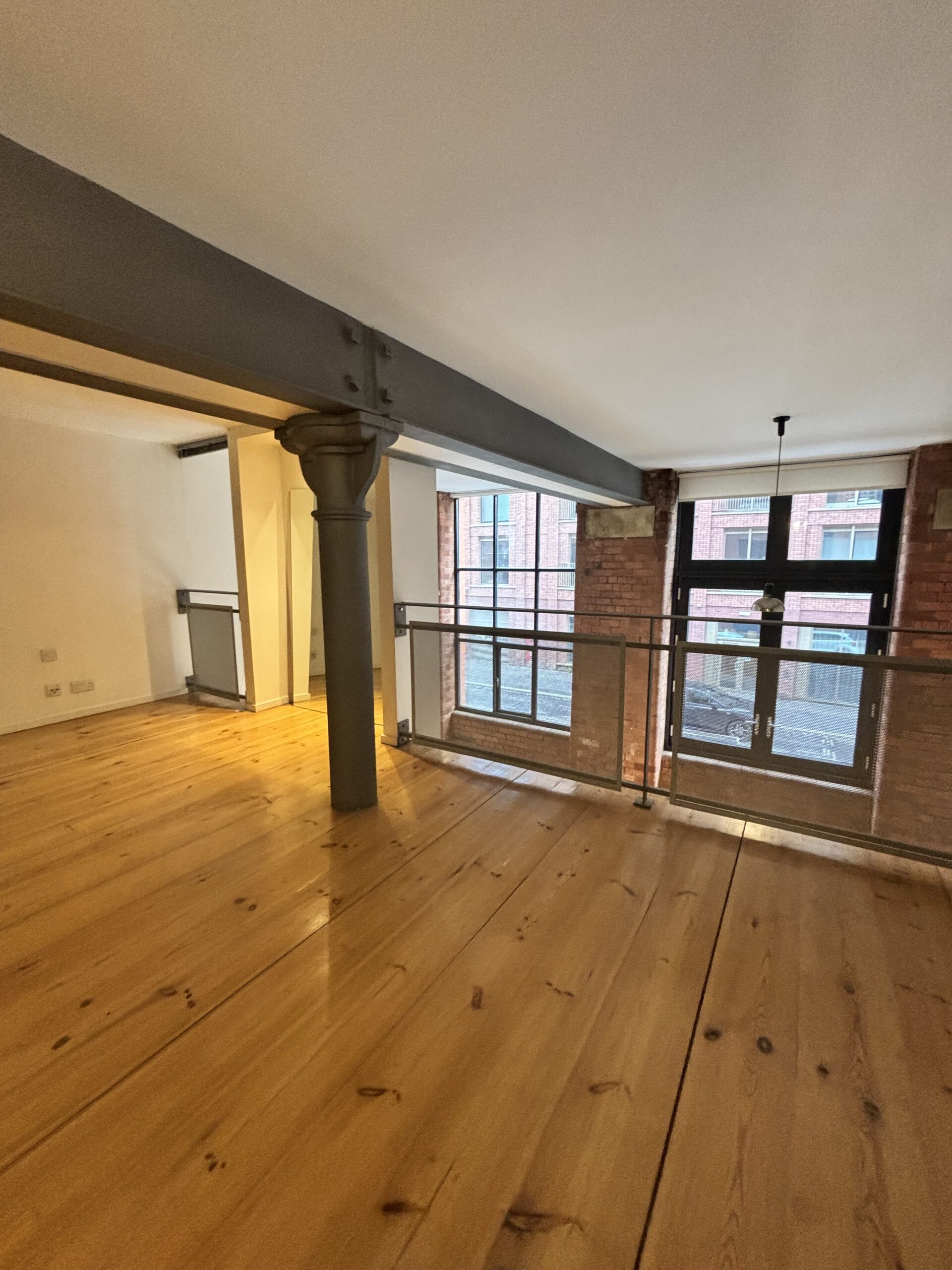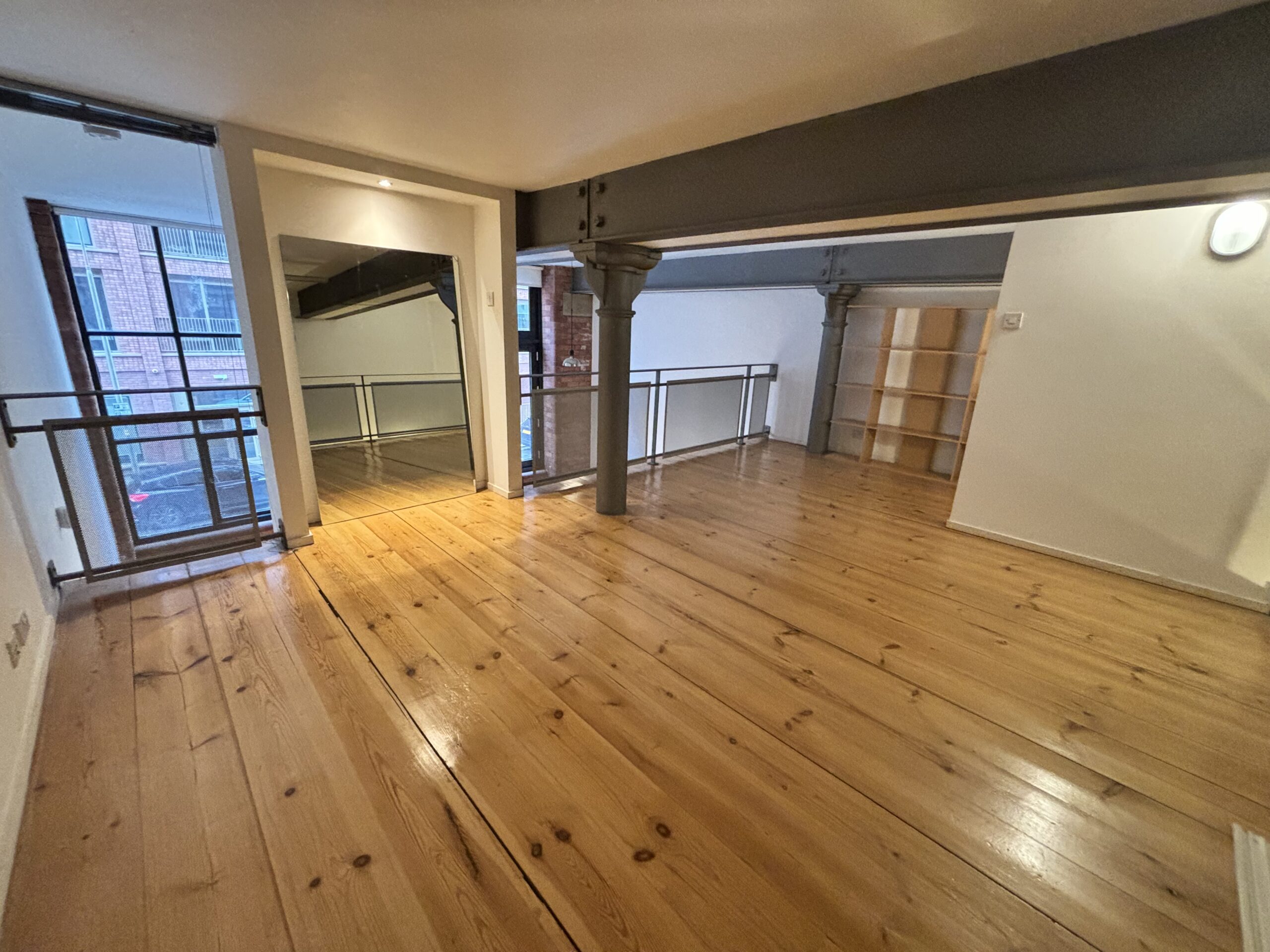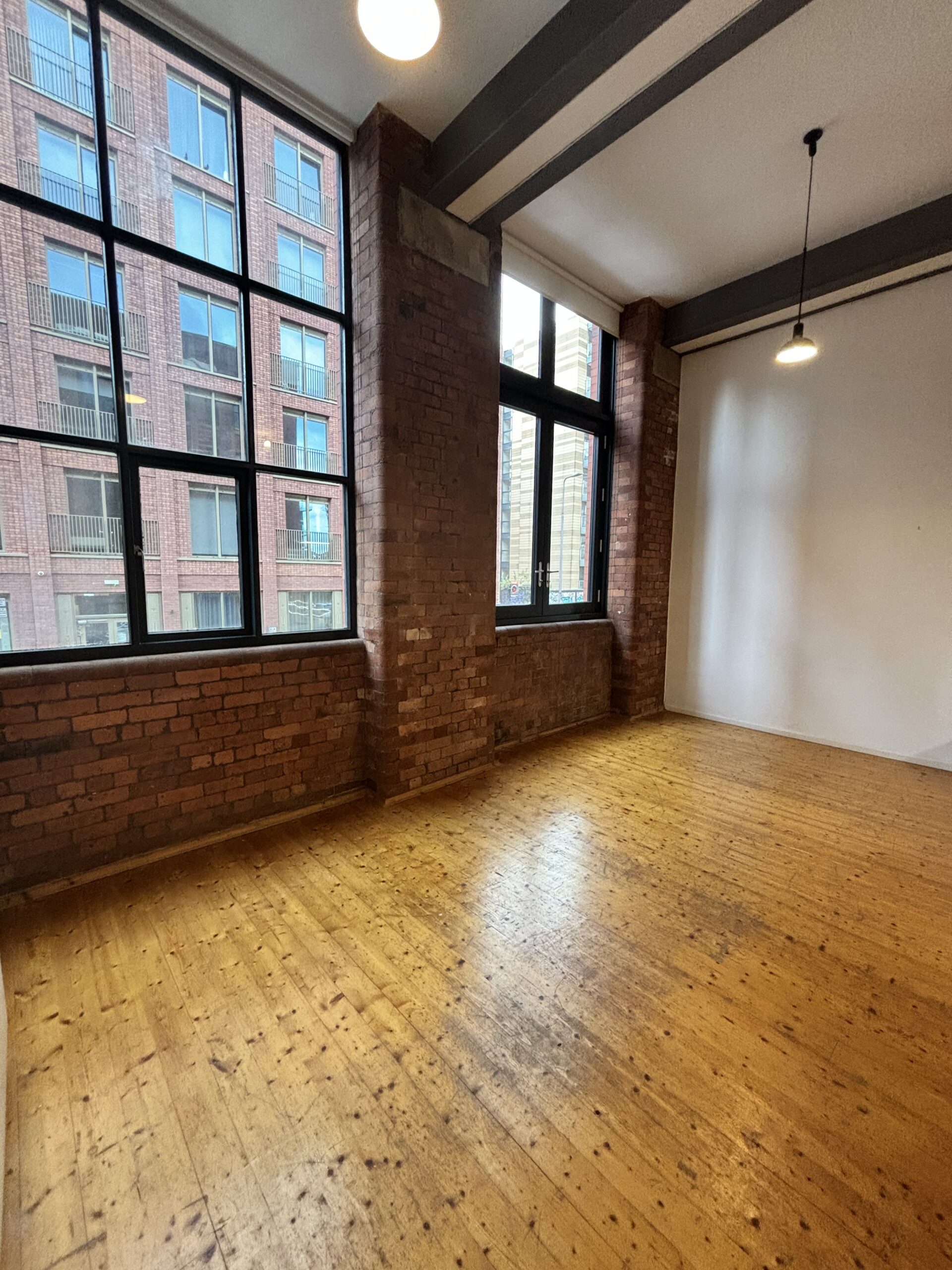Large open plan living area with original wooden flooring throughout, exposed brickwork and two warehouse feature windows allowing in plenty of light