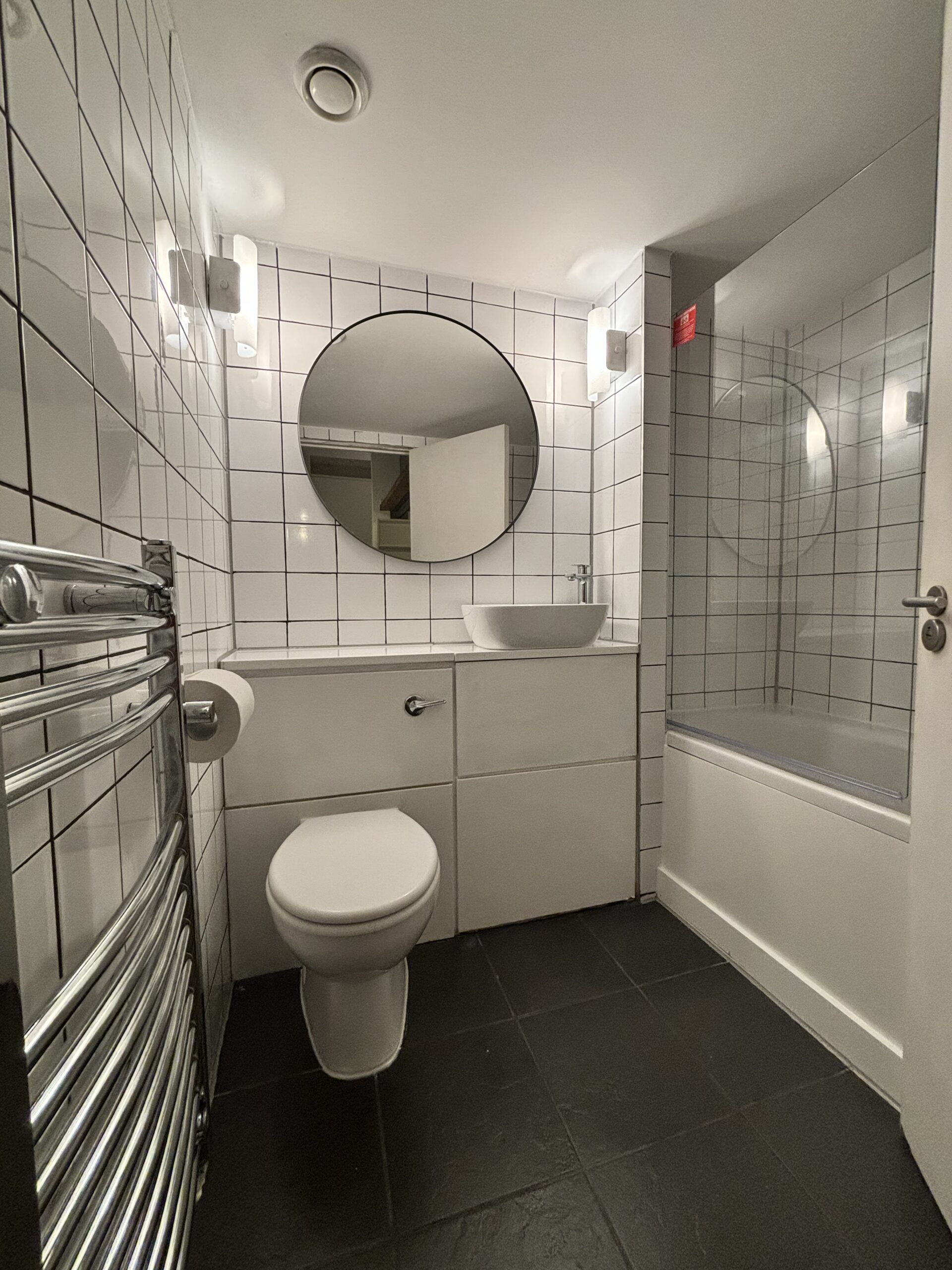Bathroom to left with contrasting white and grey tiles, shower over bath and chrome towel radiator