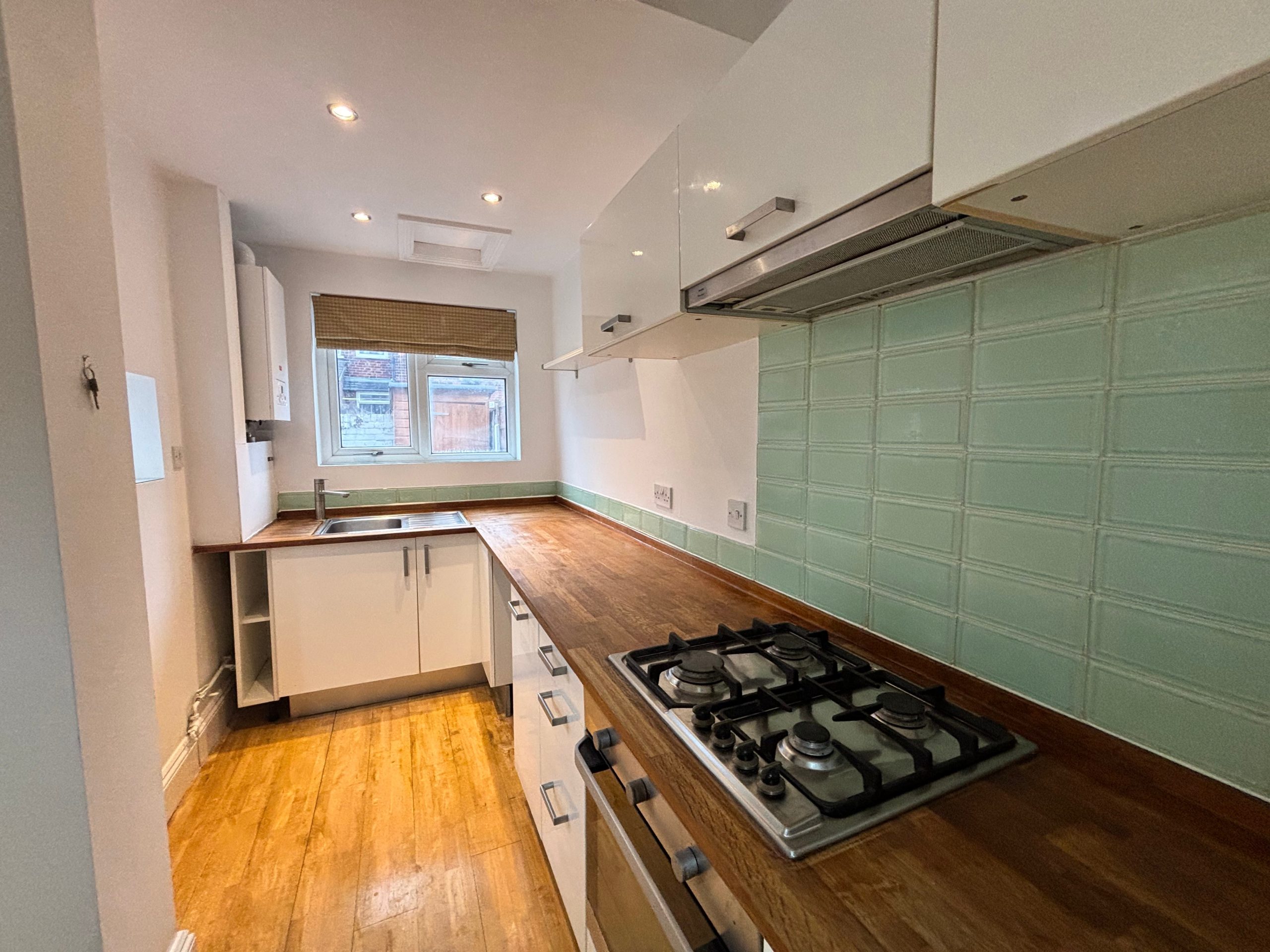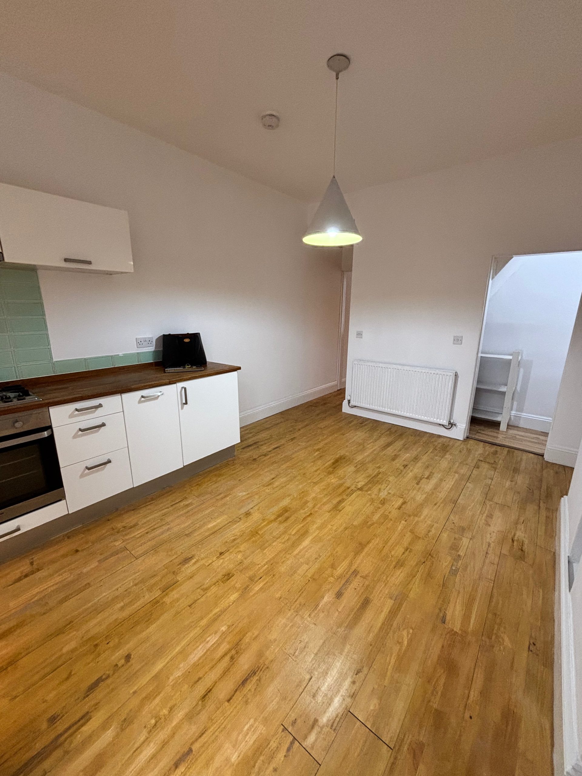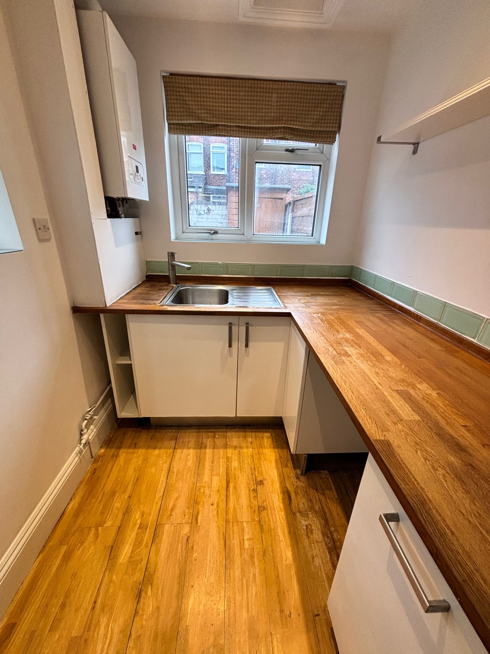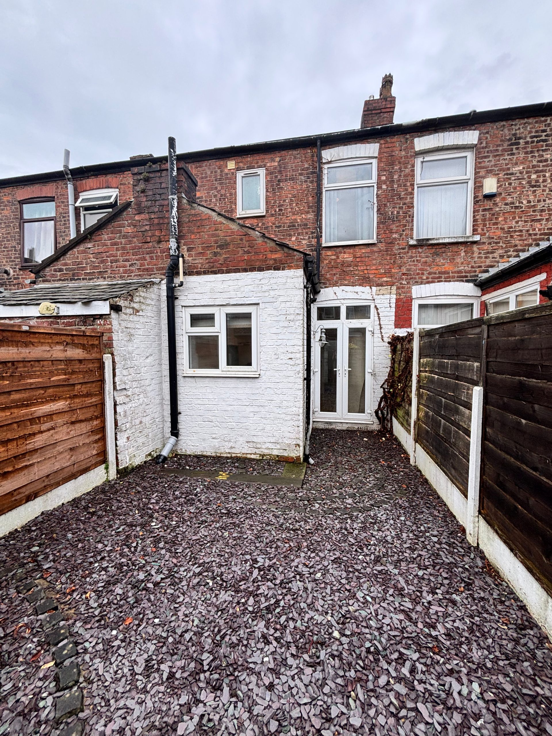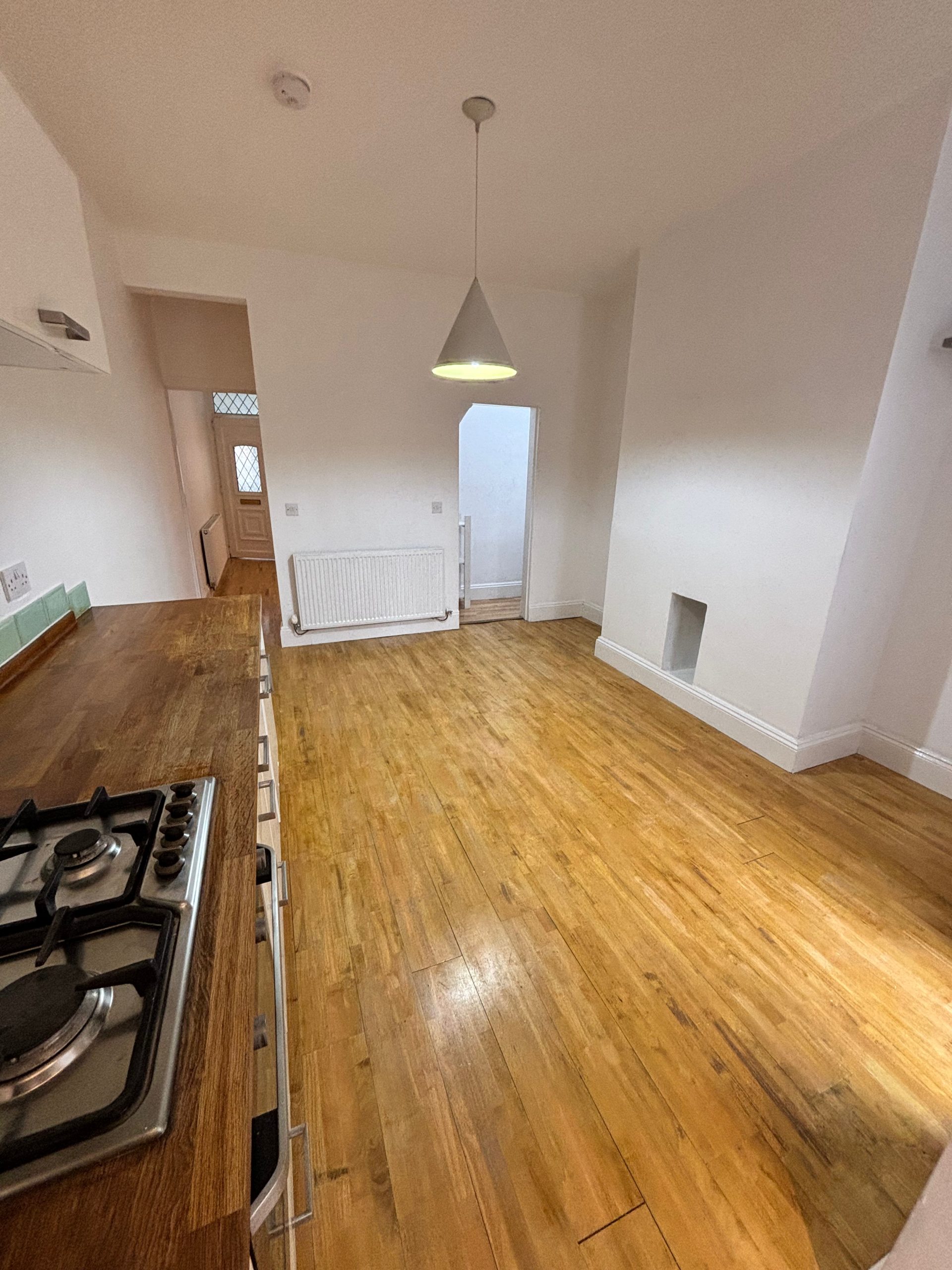 Large open plan Dining Room and Kitchen to the back of the property with fitted kitchen, ย gas hob and oven, new boiler, and plumbing for washing machine. ย French doors lead out onto low maintenance shale garden with shed and gate