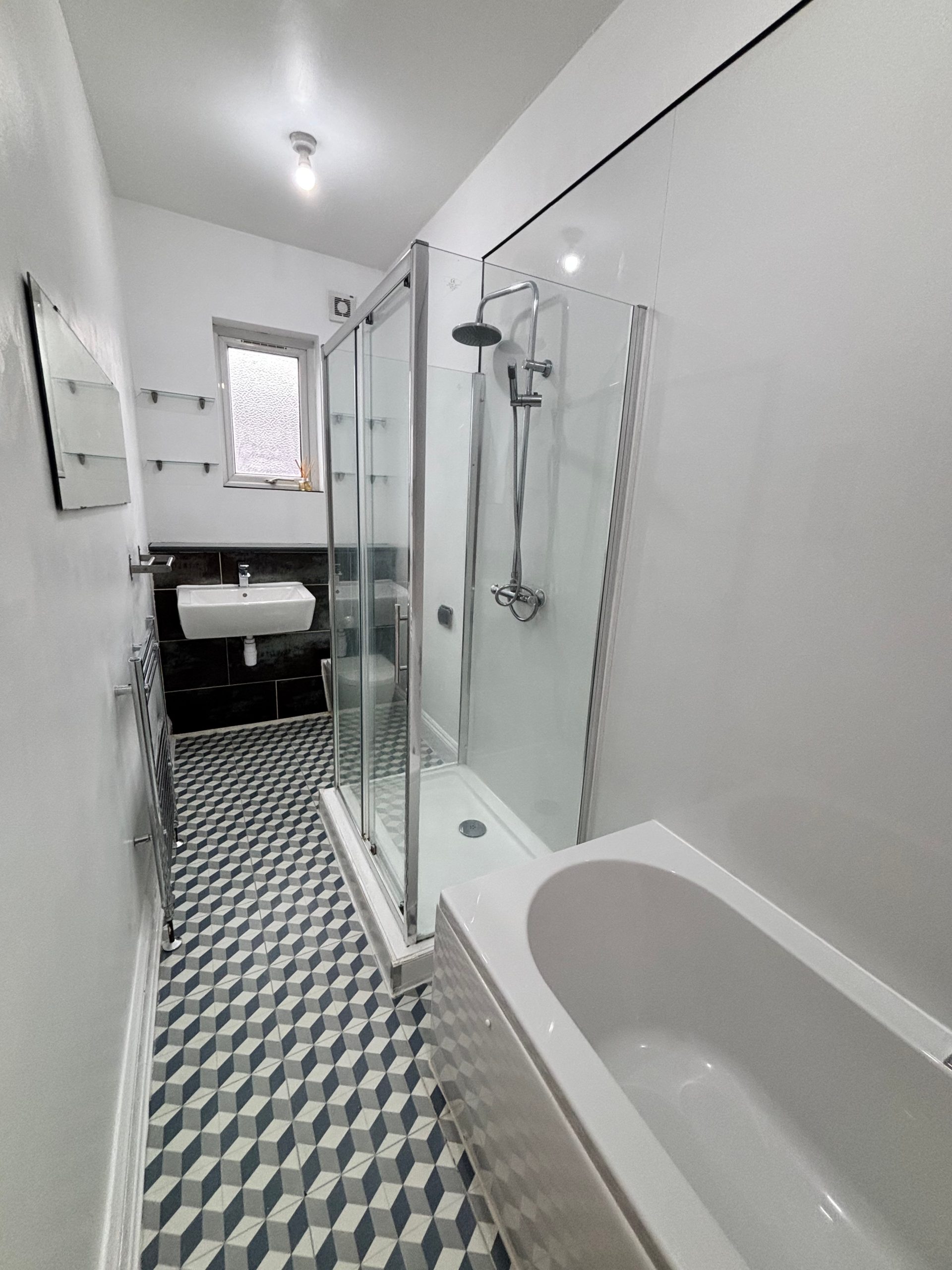 Large bathroom with fully fitted bathroom suite consisting of bath tub, separate shower cubicle, towel radiator sink, and toilet