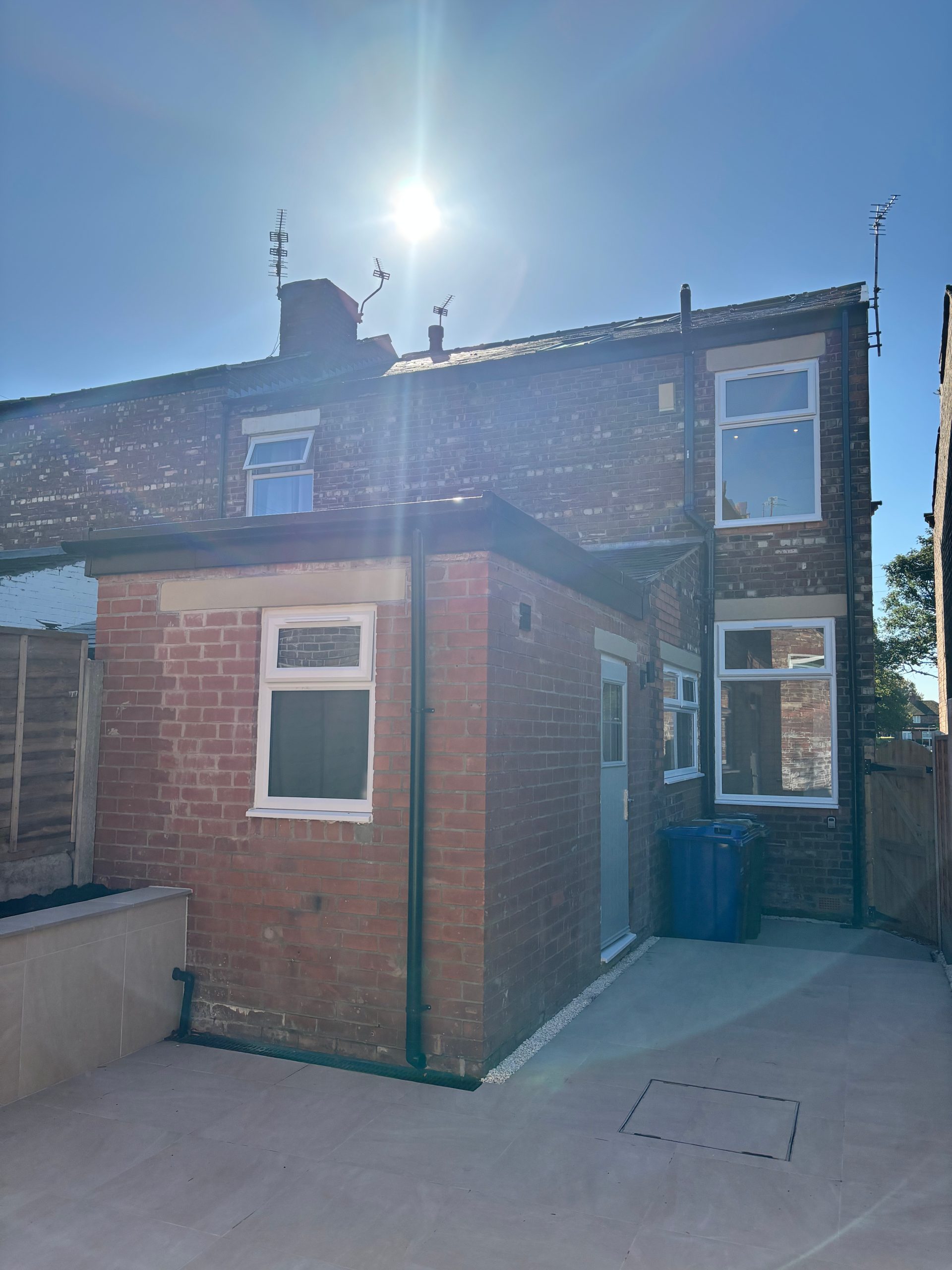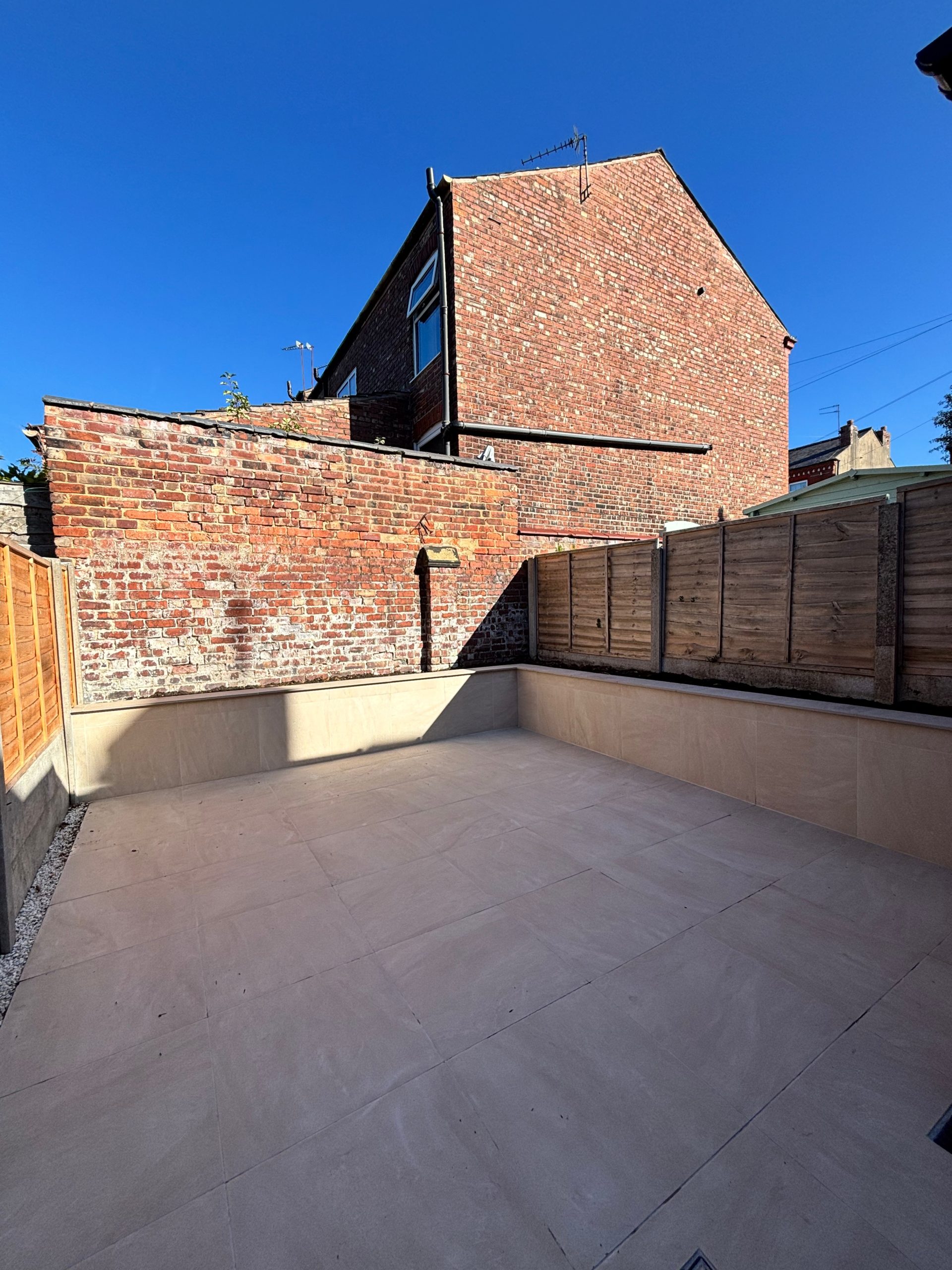 Side door leads onto a modern style private back terrace with space for pot plants and outside seating