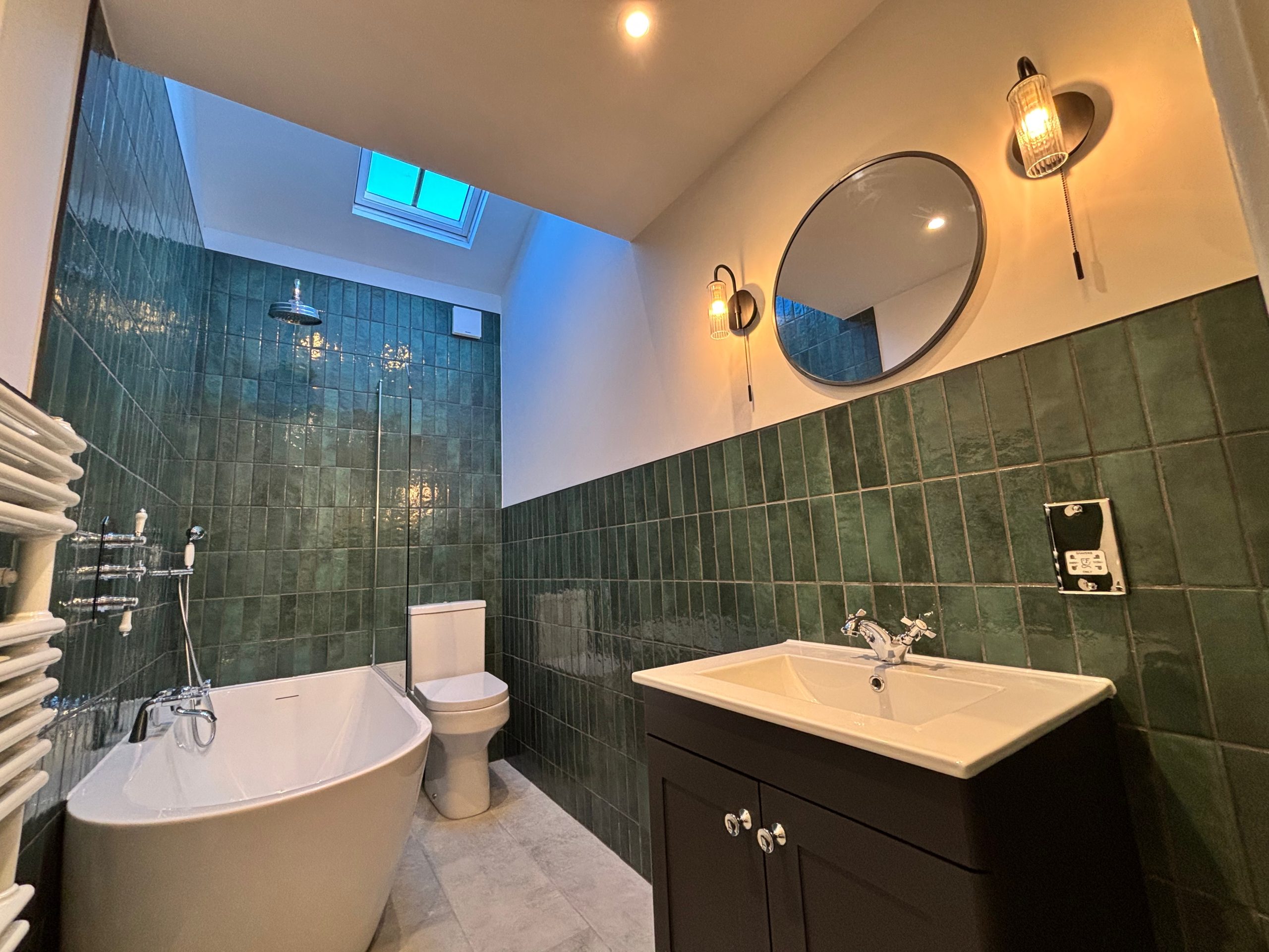 Impressive bathroom with rainfall shower head, sleek modern bath, sink, vanity unit, toilet and towel radiator with the addition of a ceiling window to allow in so much light