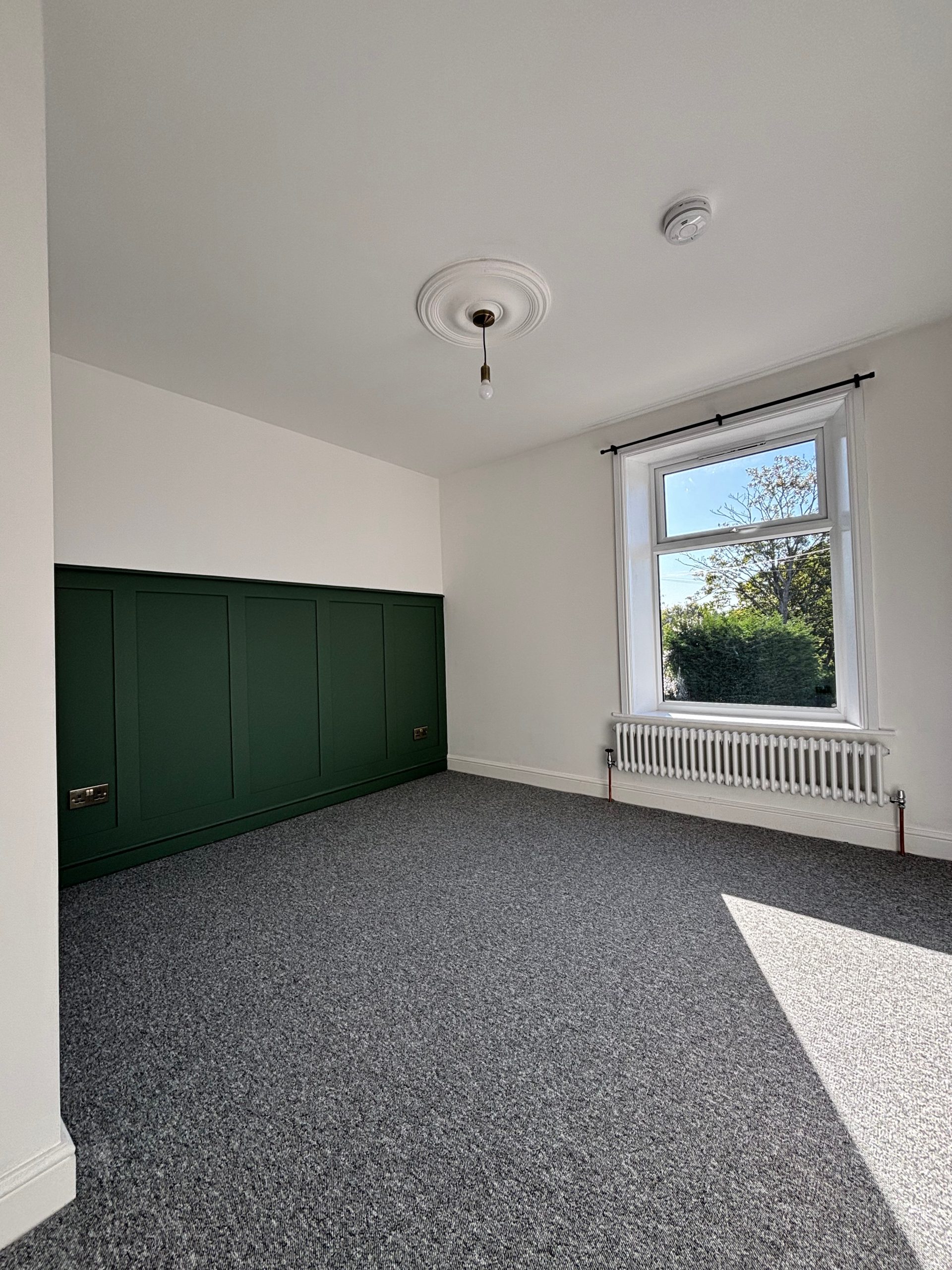 Main bedroom to front of the building with stylish panel decoration and small storage cupboard