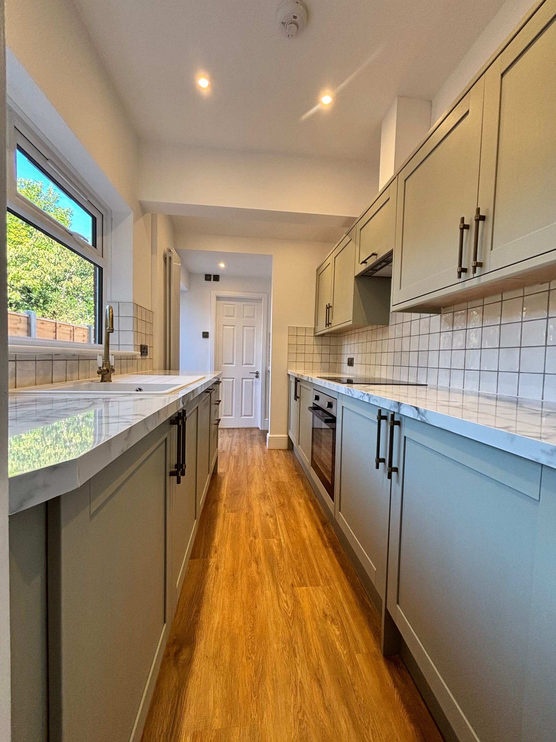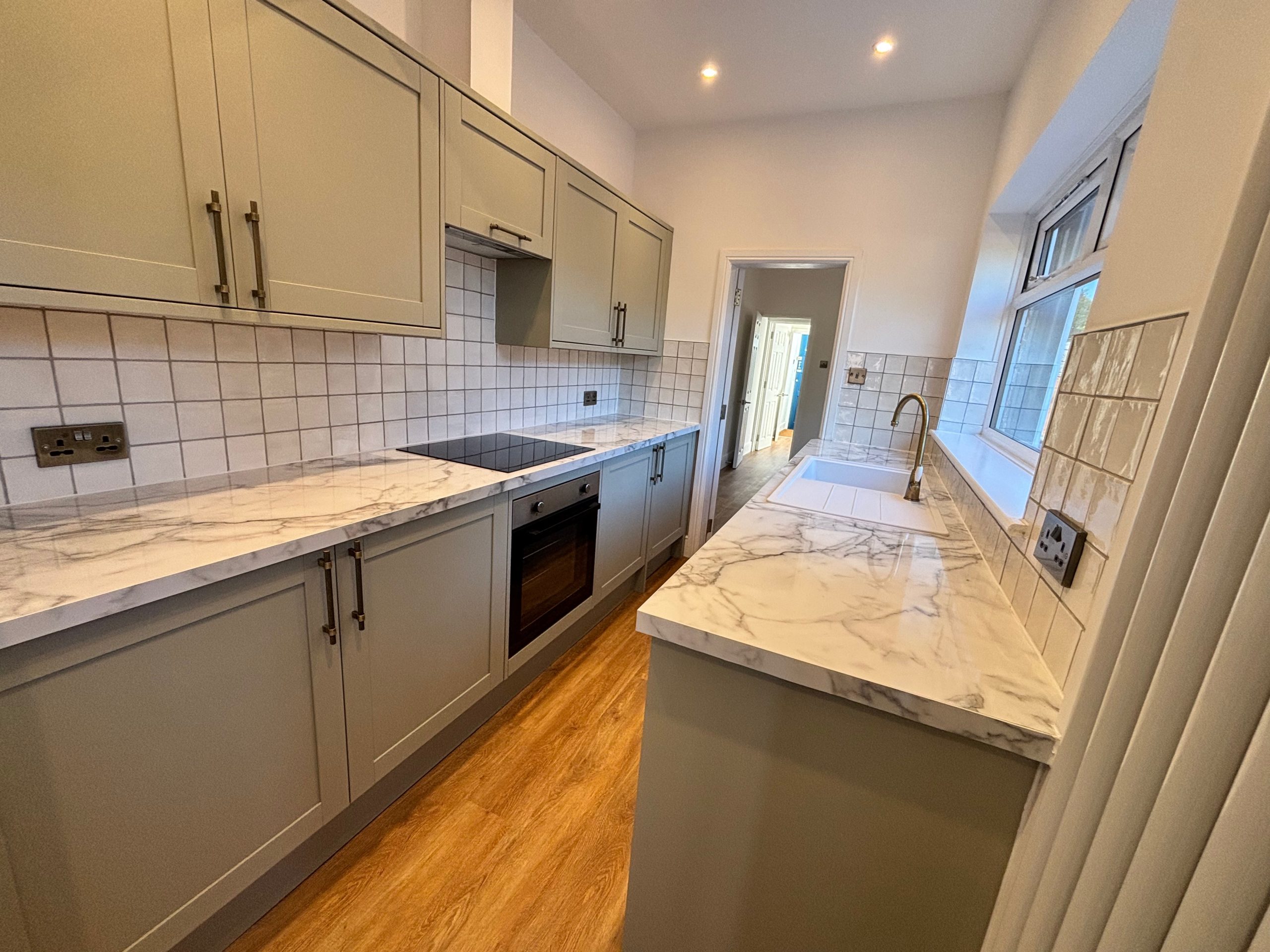Large galley style, brand new kitchen which features built in fridge, freezer, and dishwasher, Electric hob and oven, and plumbing for washing machine.