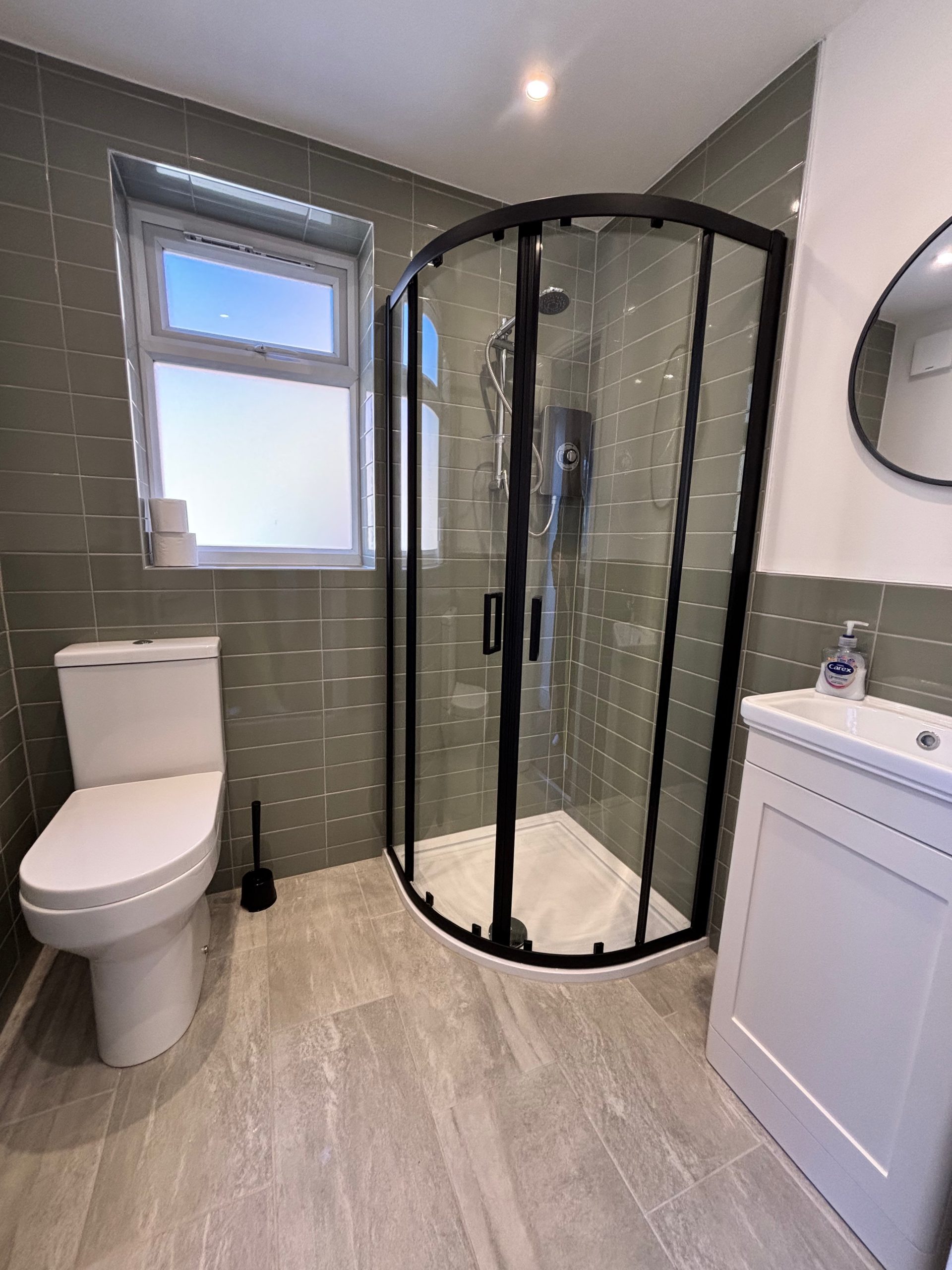 Downstairs shower room with modern shower unit, toilet and sink