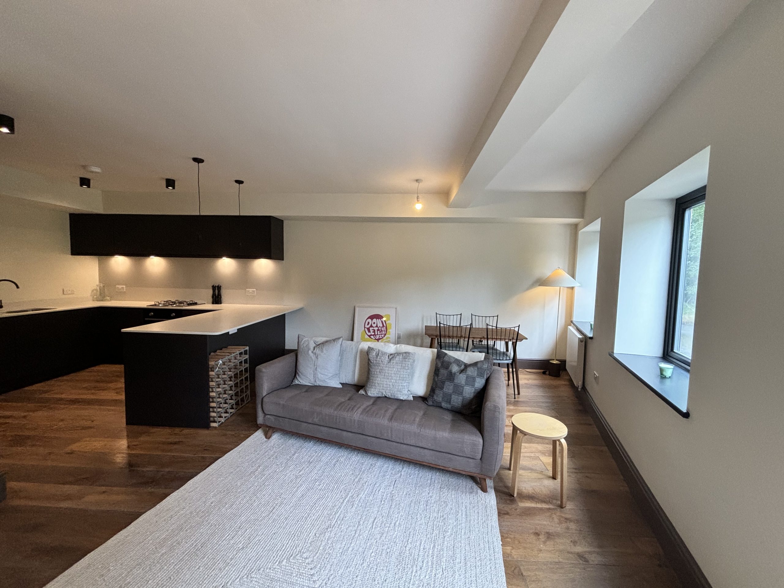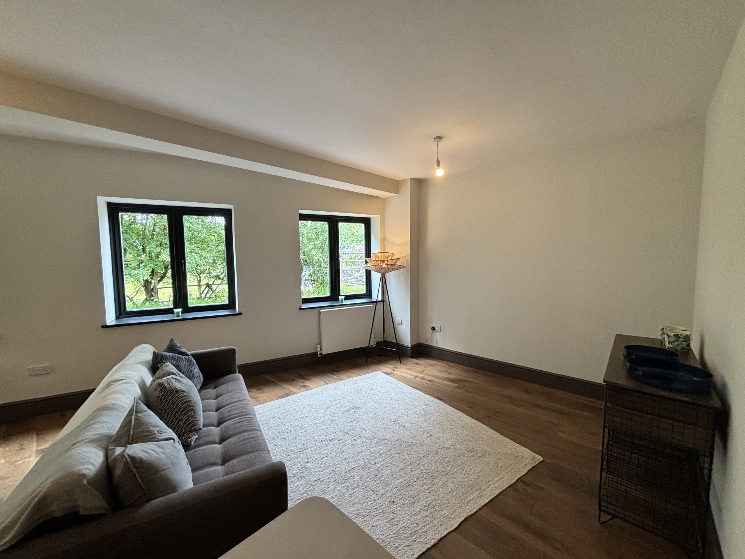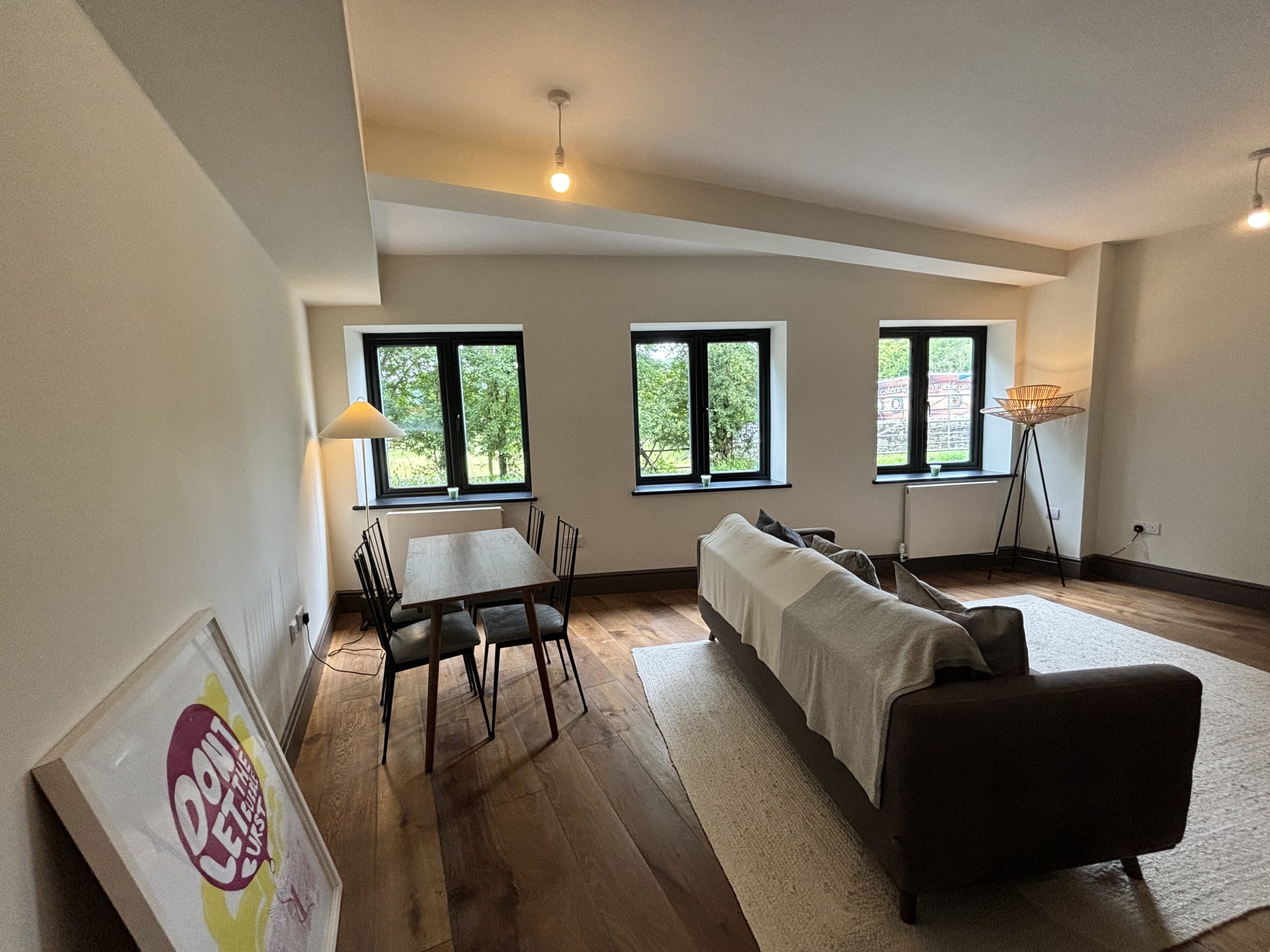 Open plan living room area with three large windows and laminate flooring