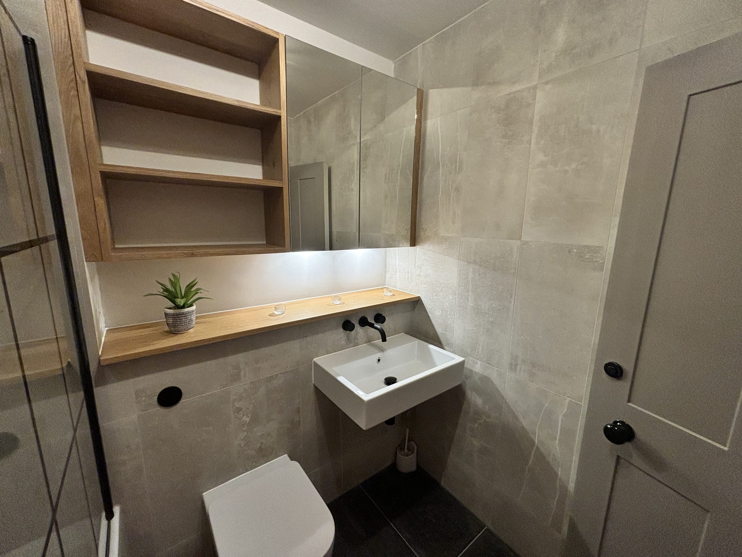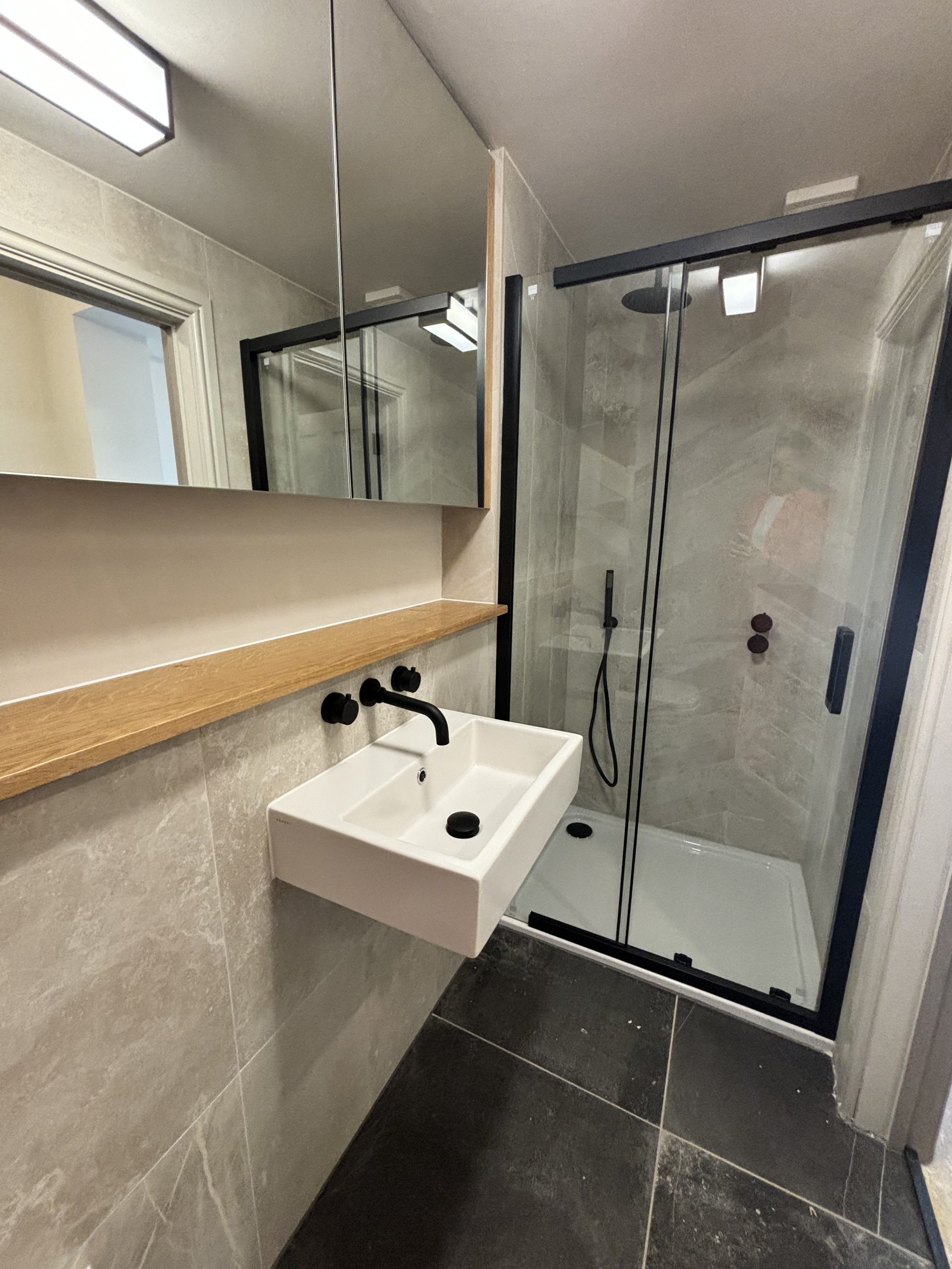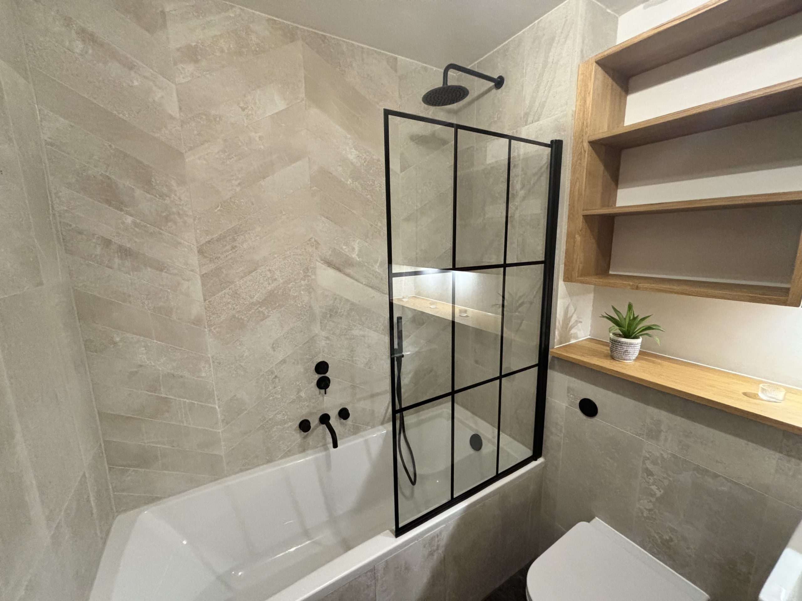 Bathroom with modern fitted bath tub, shower and shower screen, along with black fittings